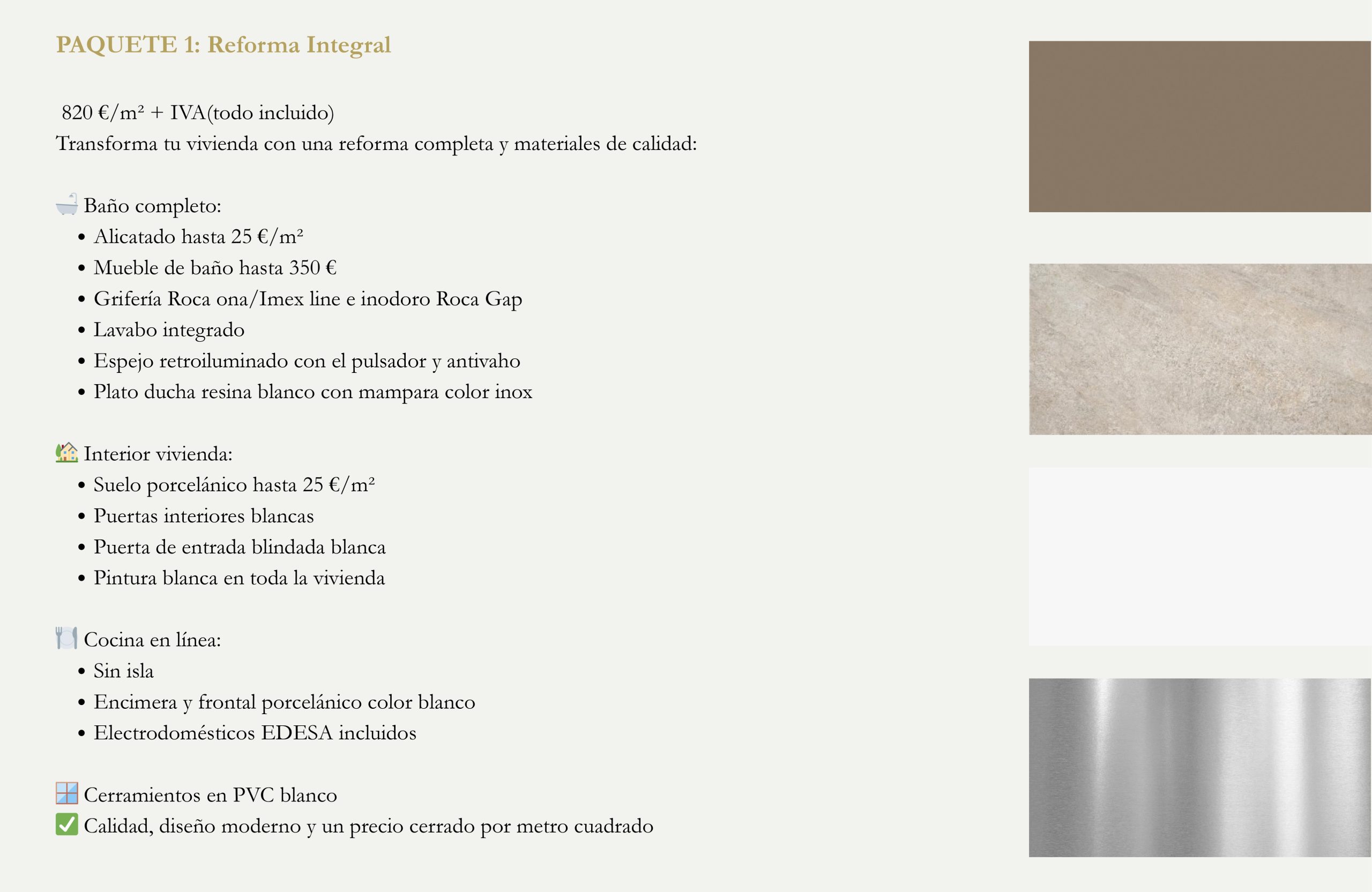 Nuestro paquete más completo. Incluye reforma integral de toda la vivienda con acabados de alta gama, diseño personalizado, asesoramiento en decoración y materiales premium. Pensado para quienes buscan una transformación total con un resultado exclusivo y duradero.